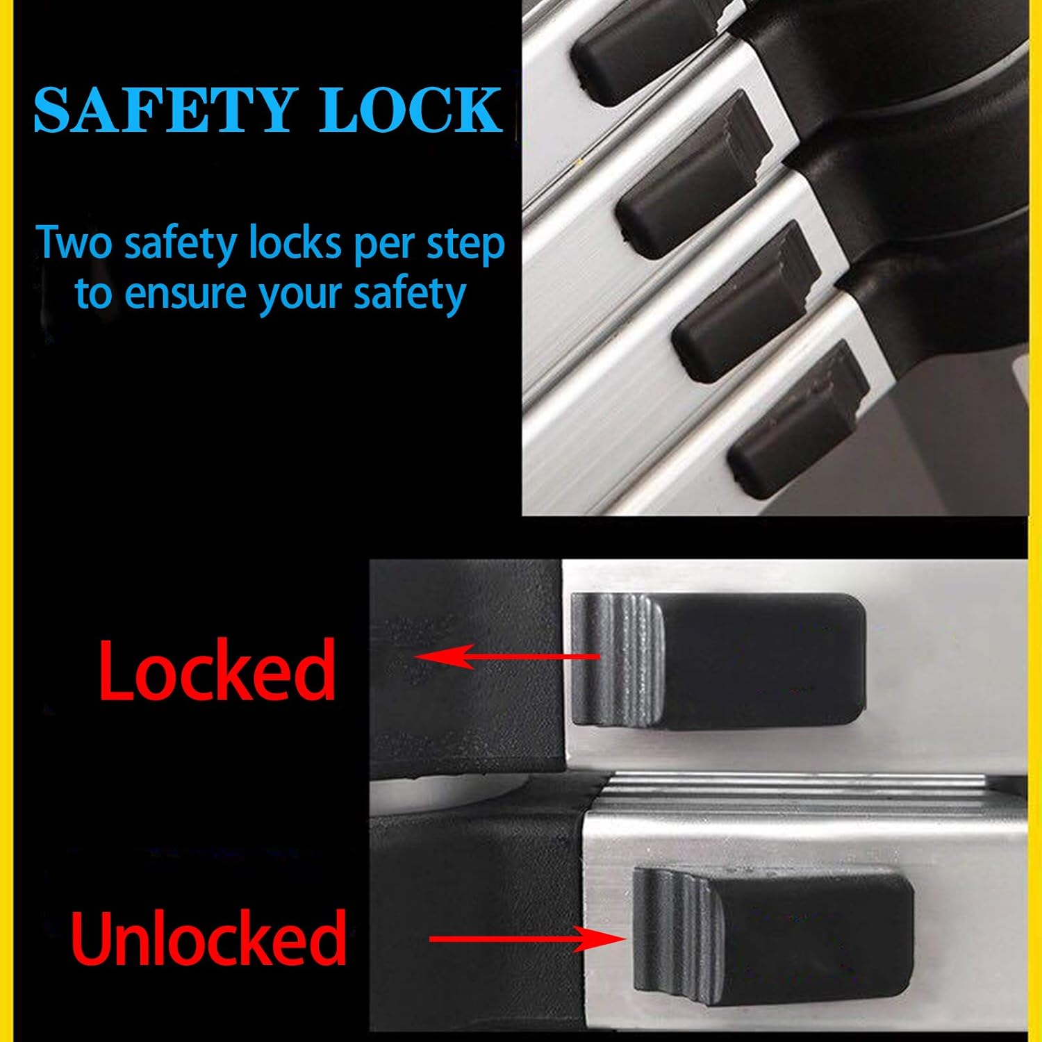 Our portable folding ladder is approved by Safety Standard EN131, can be used as a telescoping ladder, twin stepladder, stairway stepladder, and as two scaffold bases, which is a good helper for life.Specifications:Step: 5+6 StepsMaterial: AluminumMax Load: 150kg/330lbExpanded Length: 170cm+200cm/5.6FT+6.6FTExpanded Height: 163cm/5.4FTFoot Spacing: 99cm/3.25FTSpace Between Two Rungs: 30cm/11.8inFolding Size: Length-44cm/17.32in Width-14cm/5.51in Height-68cm/26.77inPedal Width: Large-73mm/2.87in Small-39mm/1.54inWeight: 9.7kg/21.38lbSpace Between Two Rungs: 30cmFeatures:High quality foldable telescopic style ladder. Foldable design, convenient to use and easy to carry around2.87 inches anti-slip widened pedal, extra big foot and safety handrail make climing more confidenceEasily stored in everywhere when ladder is closed. Lightweight yet durable and compact for easy storage and transportationSafety lock design makes extension and retraction much easierThe ladder comes with high quality rubber feet for extra stability and grip and stable locking between two neighboring steps to avoid bumping and frictionThe ladder is highly versatile and can be used for many tasks, no matter at home or work, which is a good helper for lifeManufactured to the highest standard, this ladder conforms to EN131 standards and is CE registeredPackage Includes:1 x 5+6 Steps Telescoping LadderNote:A. Read This Instruction Manual Carefully Before Using The LadderB. Make sure each of the steps Full Extension when use it as Frame ladder
